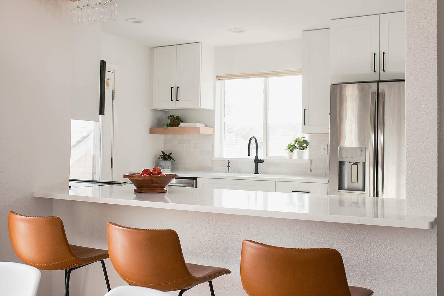 Our foremost task was to create a seamless flow between the kitchen, dining, and living areas. By expertly removing a section of wall, we opened up the space, allowing natural light to dance across the room. The addition of white shaker cabinetry brightened the room, while white quartz countertops with a convenient overhang for bar seating provide both functionality and elegance.